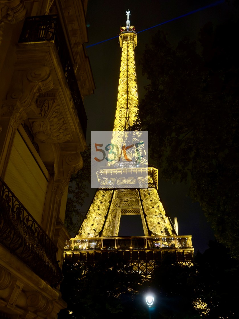 A night time view of the Eiffel Tower and the Olympic Games 2024 in Paris, France.